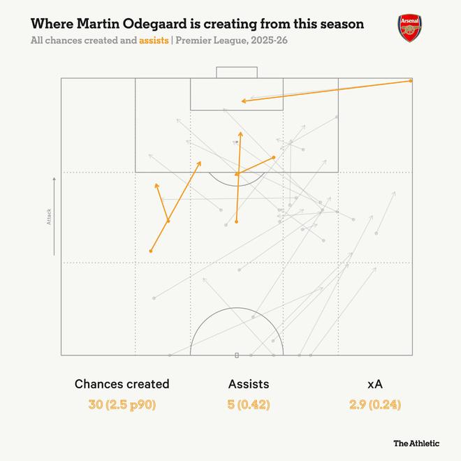 厄德高本赛季的第一次助攻来自角球,由加布里埃尔在9月客场对阵纽卡斯尔时头球破门。但那一次进攻的闪光点,是他向左路的刘易斯-斯凯利送出一脚直塞,将球传入进攻三区……